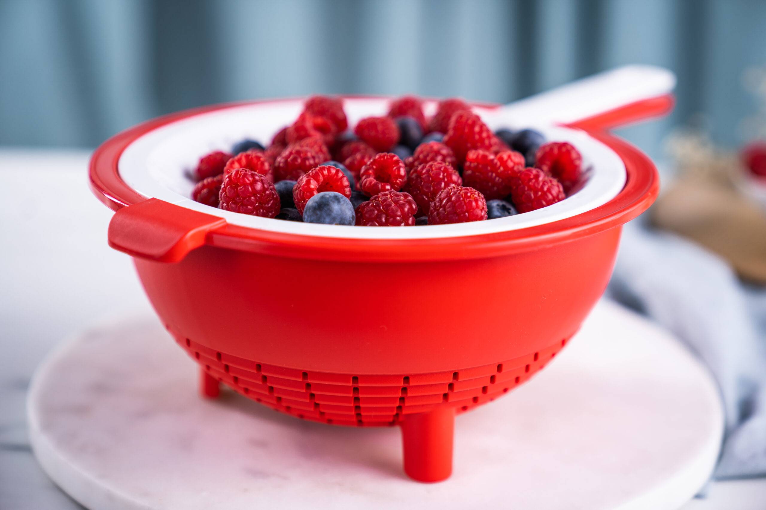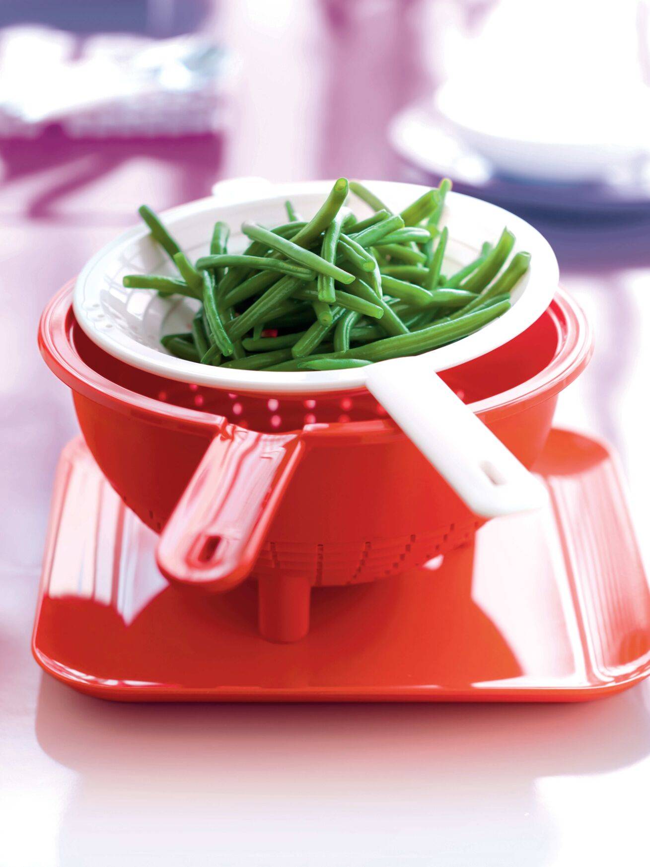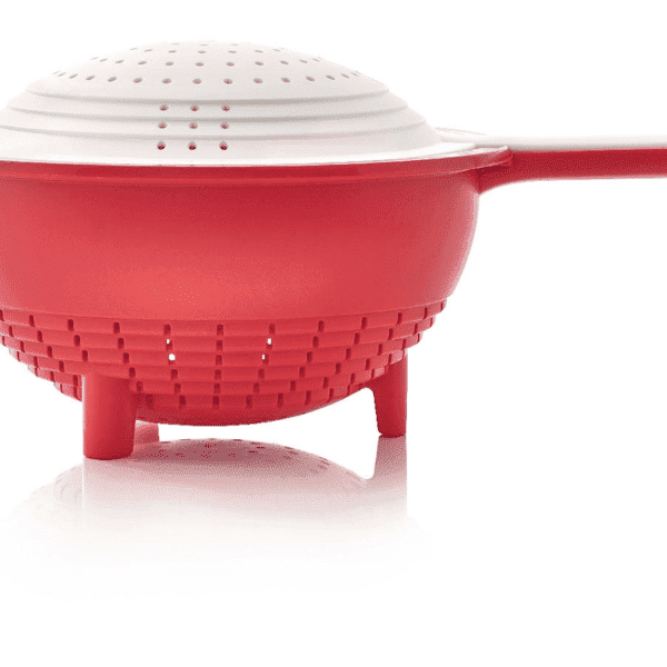 - Dankzij de getrapte groeven kan je deze vergieten bovenop Tupperware kommen plaatsen die overeenkomen met de diameter van de groeven.